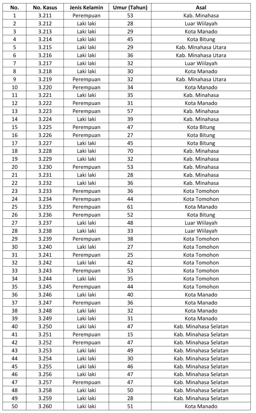 Berikut rincian ke-50 pasien terkonfirmasi positif Covid-19 yang merupakan pasien ke-3.211 sampai dengan pasien ke-3.260 di Sulut: