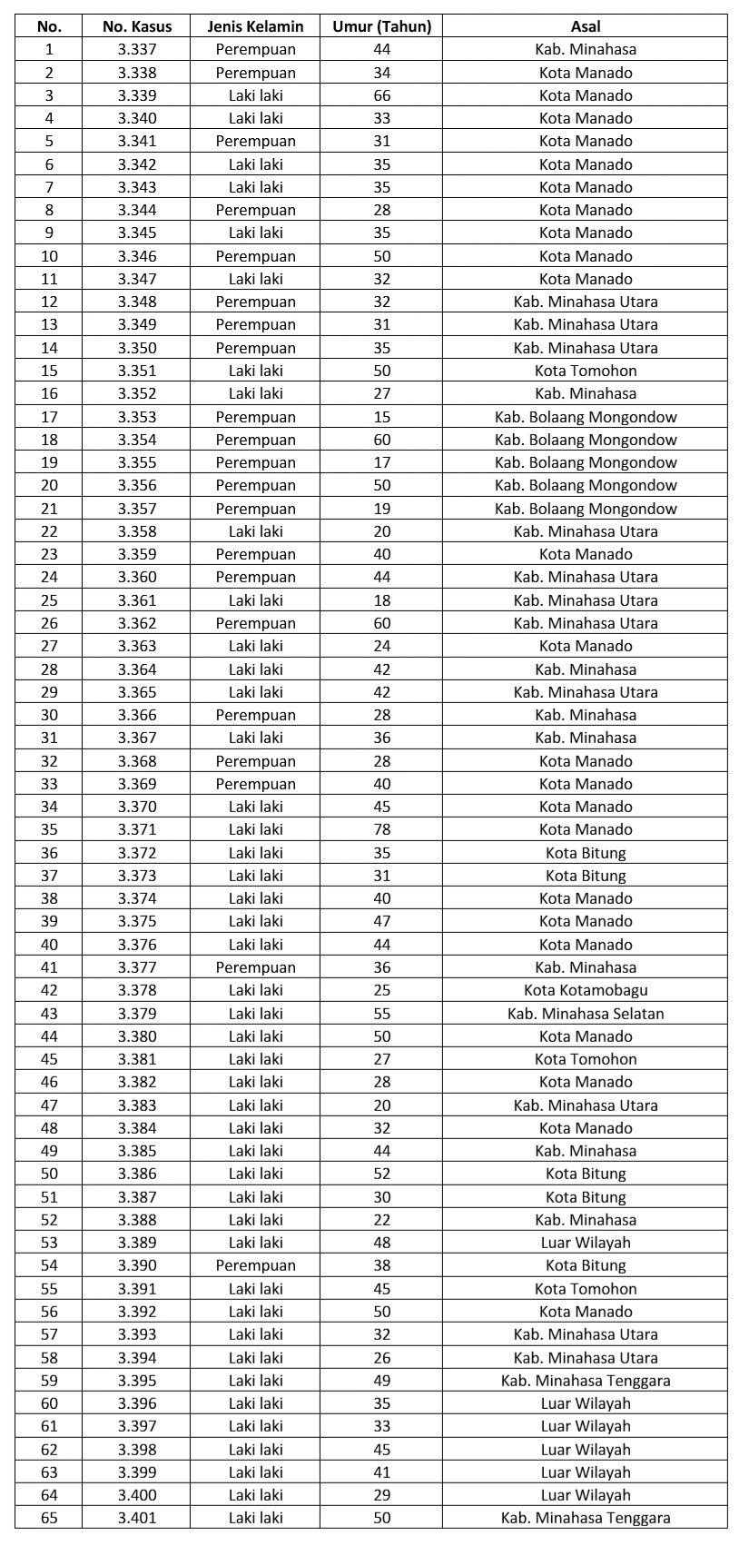Berikut rincian ke-65 pasien terkonfirmasi positif Covid-19 yang merupakan pasien ke-3.337 sampai dengan pasien ke-3.401 di Sulut: