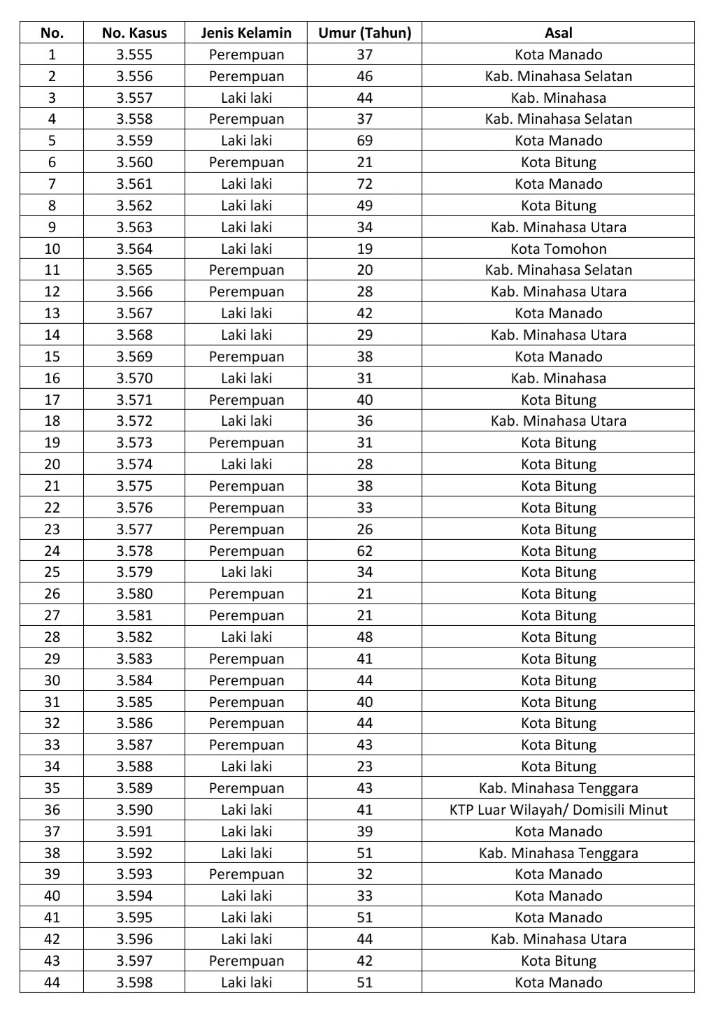 Berikut rincian ke-44 pasien terkonfirmasi positif Covid-19 yang merupakan pasien ke-3.555 sampai dengan pasien ke-3.598 di Sulut: