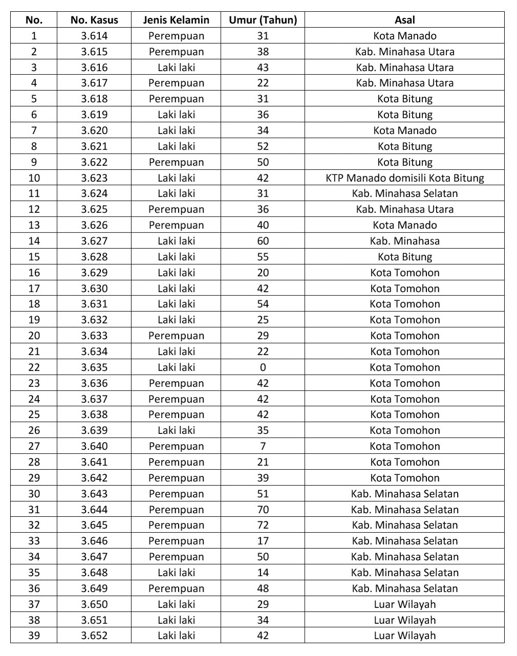 Berikut rincian ke-39 pasien terkonfirmasi positif Covid-19 yang merupakan pasien ke-3.614 sampai dengan pasien ke-3.652 di Sulut: