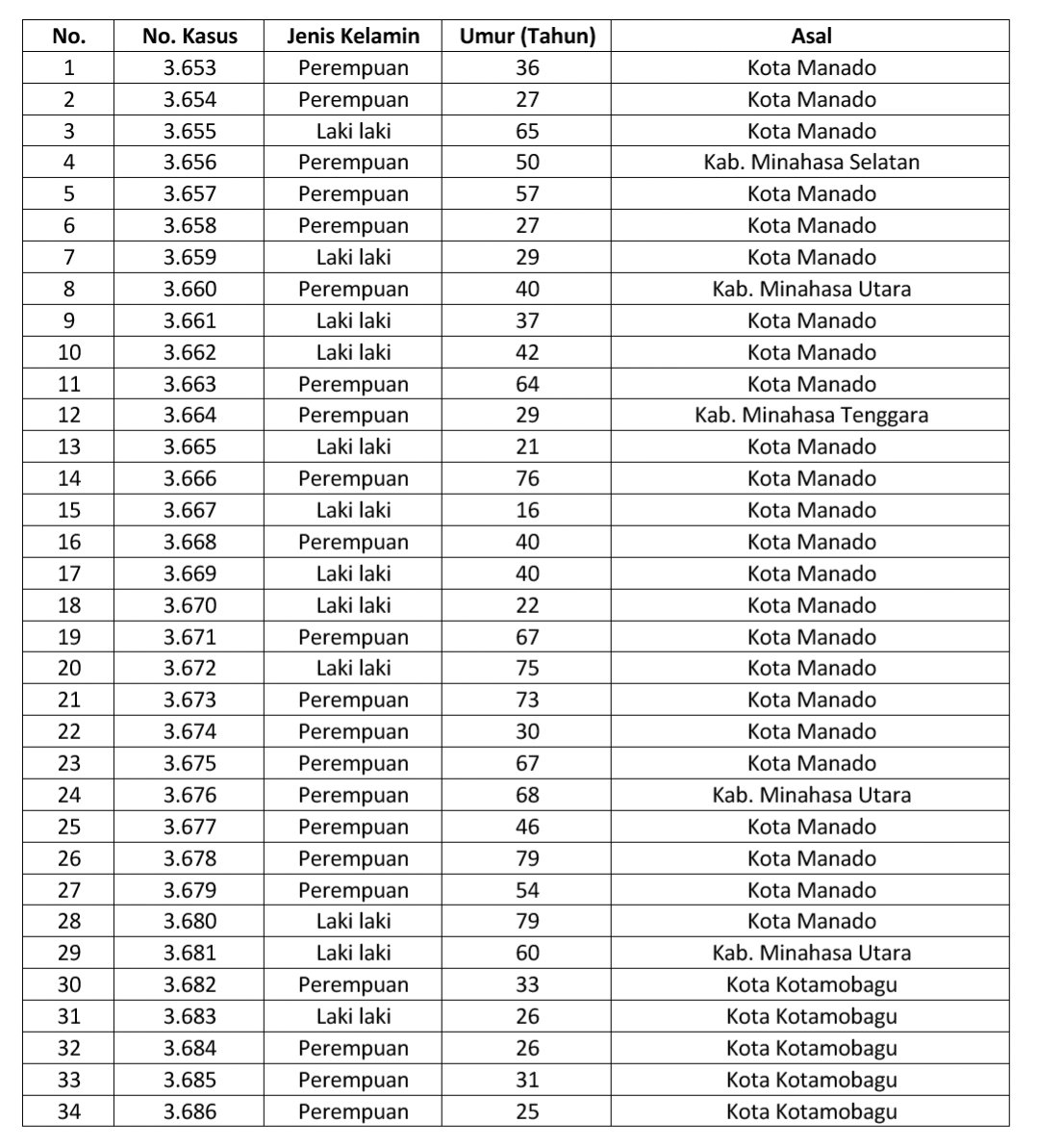 Berikut rincian ke-34 pasien terkonfirmasi positif Covid-19 yang merupakan pasien ke-3.653 sampai dengan pasien ke-3.686 di Sulut: