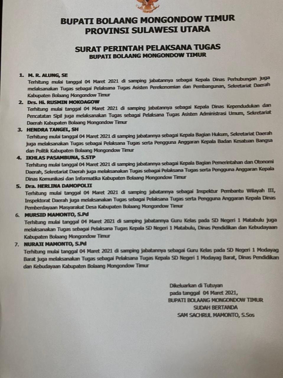 Jabatan yang disebutkan di atas diantaranya Asisten Bidang Perekonomian, Asisten Bidang Administrasi Umum, Kepala Badan Kesatuan Bangsa dan Politik (Kesbangpol), Kepala Dinas Komunikasi dan Informatika (Kominfo), Kepala Dinas Pemberdayaan Masyarakat Desa (DPMD), Kepala Sekolah (Kepsek) SDN I Matabulu, serta Kepsek SDN 1 Modayag Barat. (Novianti Kansil)