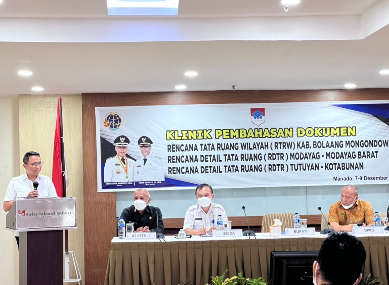 BOLTIM – Bupati Sam Sachrul Mamonto membuka kegiatan klinik pembahasan dokumen Rencana Tata Ruang Wilayah (RTRW) Kabupaten Bolaang Mongondow Timur, Rencana Detail Tata Ruang (RDTR) Modayag-Modayag Barat dan Tutuyan-Kotabunan, di Aula Swissbell Hotel Manado, Rabu (08/12).