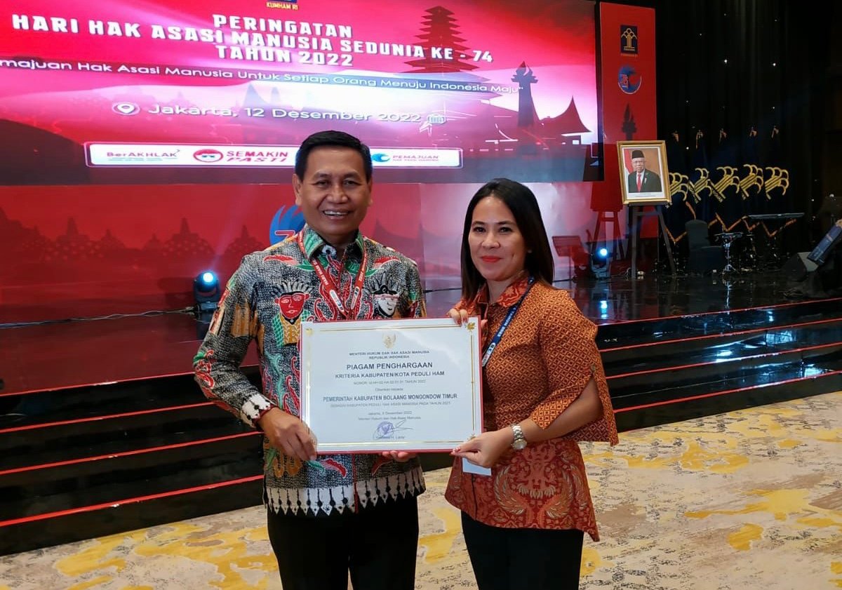 Penghargaan tersebut diserahkan langsung oleh Direktur Jenderal Hak Asasi Manusia Mualimin Abdi, kepada Pemkab Boltim melalui Kepala Bagian (Kabag) Hukum Setda Ciendy Mongkaren, di Hotel Sultan Jakarta, Senin (12/12/2022).