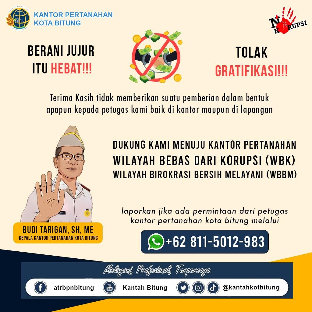 BITUNG – Kantor Pertanahan Kota Bitung terus berbenah memperbaiki layanan dan pengawasan guna menuju Kantor Pertanahan yang mendapat predikat Wilayah Bebas dari Korupsi (WBK).
