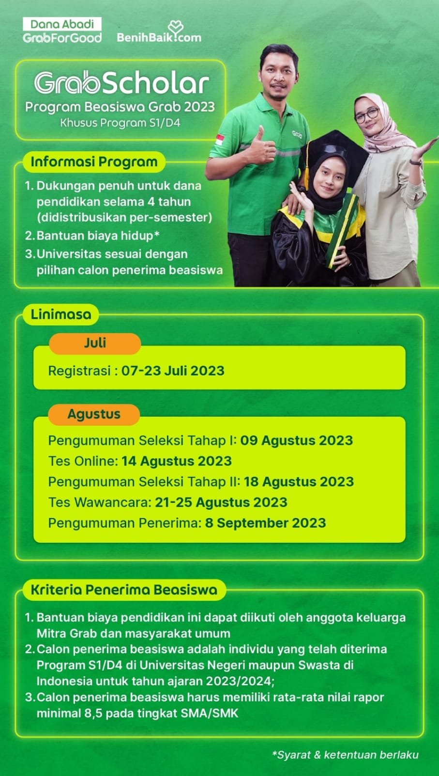 Pendaftaran GrabScholar: Program Beasiswa Grab 2023 untuk beasiswa S1/D4 dibuka dari tanggal 7-23 Juli 2023. Sementara itu, pendaftaraan untuk bantuan dana pendidikan bagi jenjang pendidikan SD, SMP, dan SMA/SMK dibuka dari tanggal 7-30 Juli 2023.