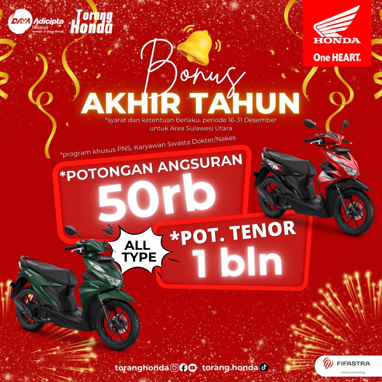 Selain promo diatas, Honda pun memberikan promo Bonus Akhir Tahun khusus kepada PNS, Karyawan Swasta, Dokter atau Tenaga Kesehatan yang ada di Sulawesi Utara yakni potongan angsuran sebesar 50 ribu dan potongan tenor 1 bulan untuk pembelian Sepeda Motor Honda tipe Matic dan Cub atau bebek.