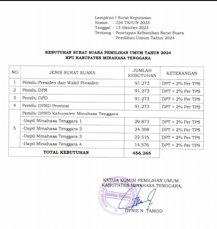 Adapun kebutuhan surat suara Pemilu 2024 di Kabupaten Minahasa Tenggara adalah 91.273 Kertas suara ditambah 2 persen setiap TPS.