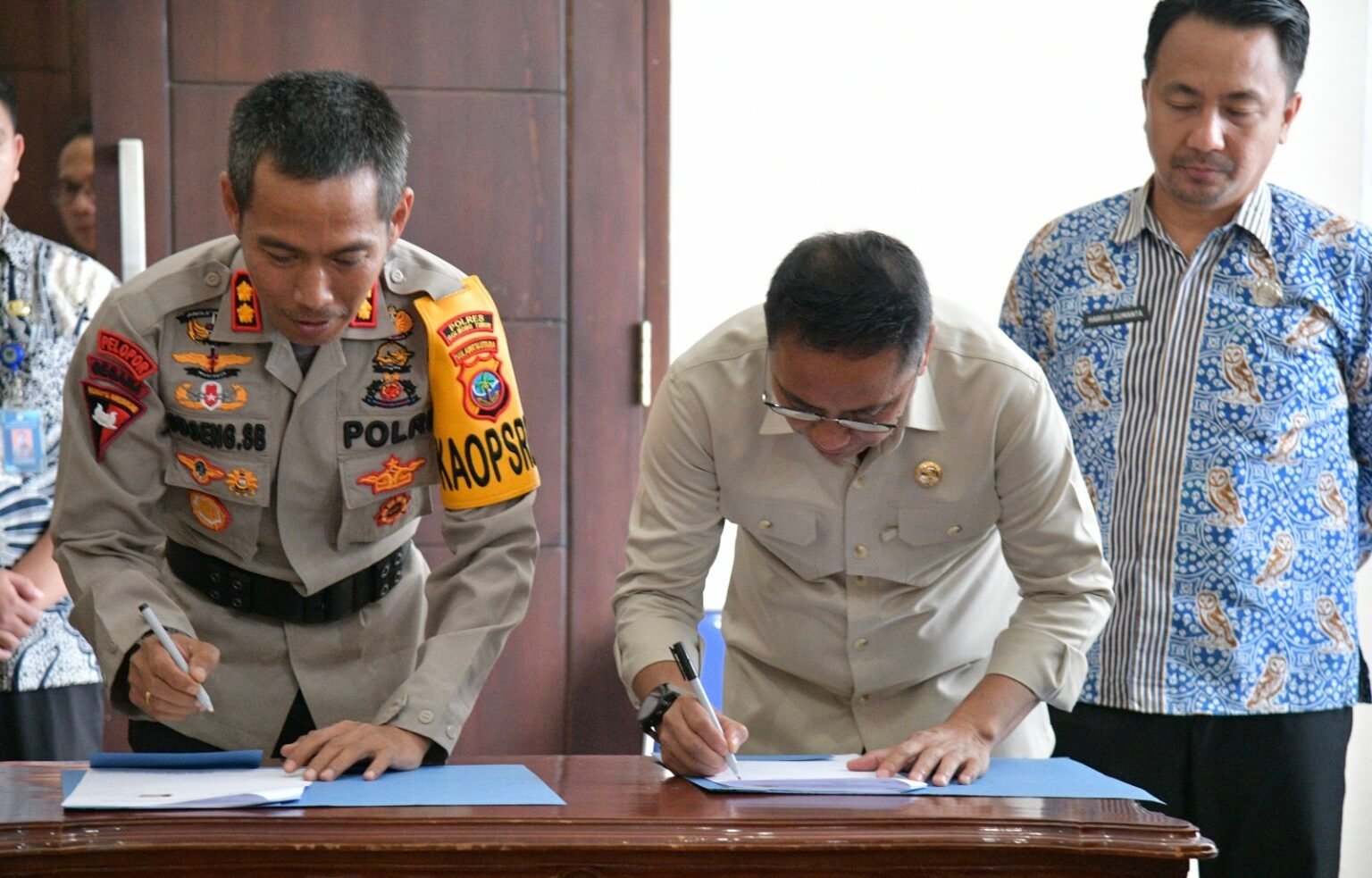 BOLTIM – Bupati Sam Sachrul Mamonto bersama Kapolres Boltim AKBP Sugeng Setya Budi menandatangani Naskah Perjanjian Hibah Daerah (NPHD), di ruangan kerja rapat bupati, Kamis (18/01). Dimana, Polres Boltim menerima dana hibah sebesar Rp2 miliar yang dialokasikan untuk pengamanan Pemilihan Kepala Daerah (Pilkada) tahun 2024 di.
