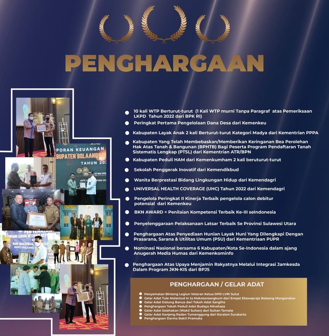 Tak hanya itu, mantan Ketua DPRD Boltim ini juga telah meraih berbagai prestasi selama menjabat, seperti penghargaan atas kepatuhan penyelenggaraan pelayanan publik dan penghargaan Wajar Tanpa Pengecualian (WTP) ke-10 dari Badan Pemeriksa Keuangan (BPK).