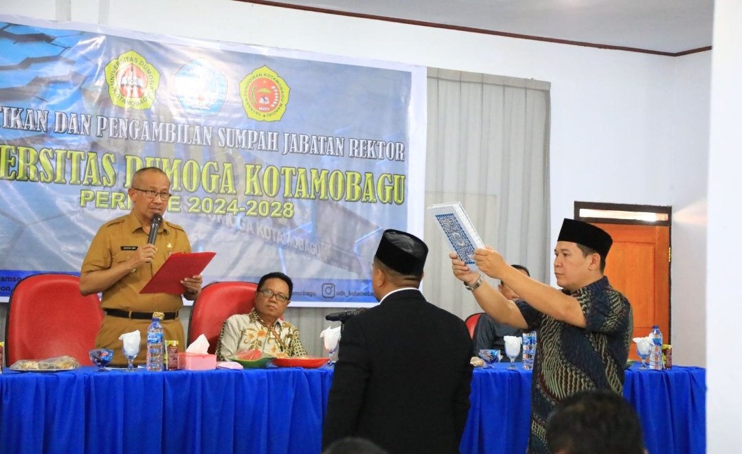 – Penjabat Wali Kota Asripan Nani yang juga selaku pembina Yayasan Pendidikan Kota Kotamobagu, melantik Muharto sebagai Rektor Universitas Dumoga Kotamobagu (UDK) masa bakti 2024-2028.