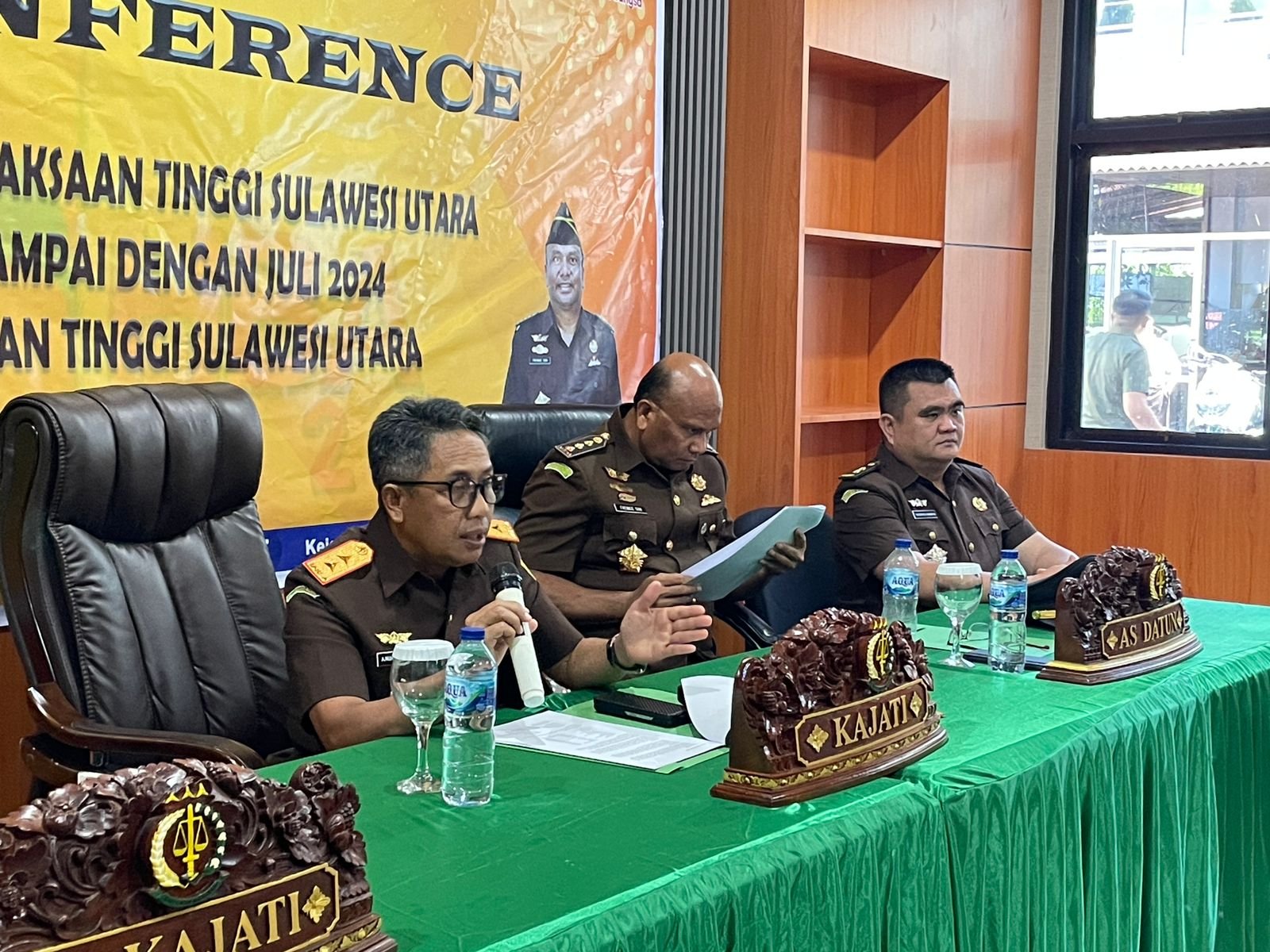 Adapun kegiatan konferensi pers ini turut dihadiri Wakajati Sulut, Transiswara Adhi; Asisten Perdata dan Tata Usaha Negara, Frenkie Son selaku Ketua HBA Ke-64 Kejati Sulut; Kepala Bagian Tata Usaha Sterry Fendi Andih, dan Kepala Seksi Penerangan Hukum dan Humas Theodorus Rumampuk. (Fernando Rumetor)