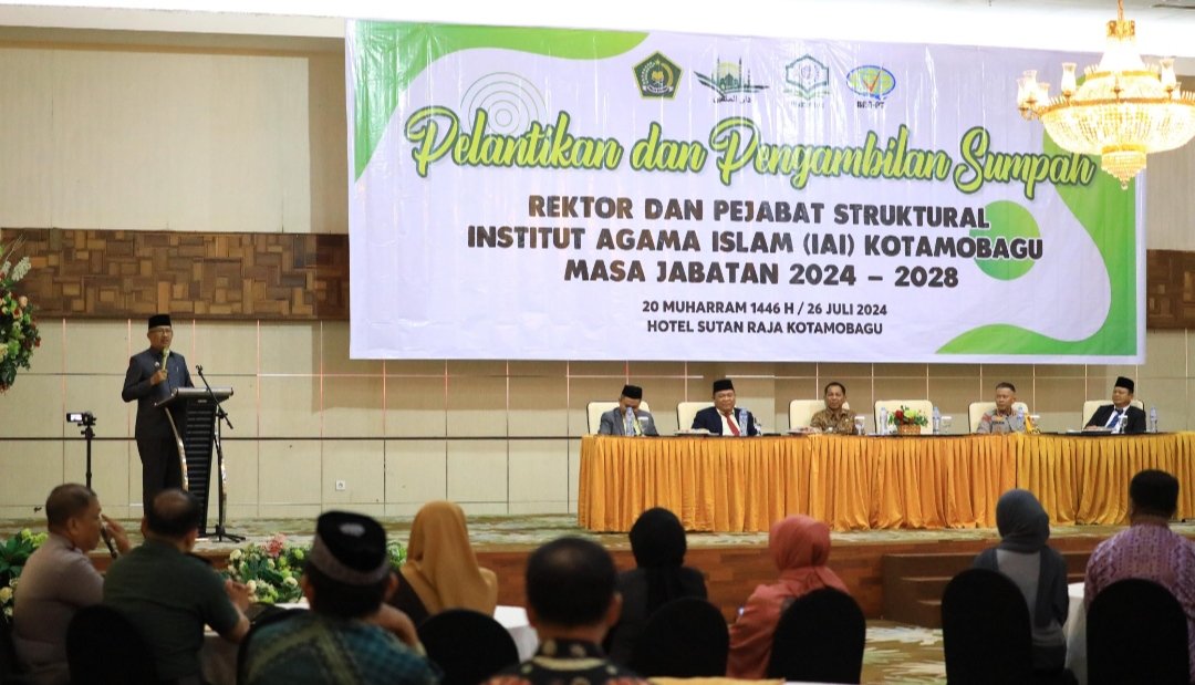 – Penjabat Wali Kota Asripan Nani menghadiri pelantikan dan pengambilan sumpah Rektor dan Pejabat Struktural Institut Agama Islam (IAI) Kotamobagu, masa jabatan 2024-2028, bertempat di Ballroom Sutanraja Hotel, Kotamobagu, Jumat (26/7/2024).