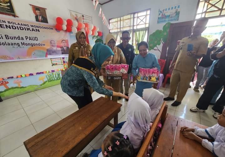 Usai penyerahan makanan tambahan kepada anak-anak di TK Darusallam Mongkoinit, Ketua TP-PKK drg Firlia Mokoginta-Mokoagow membuka kegiatan Apresiasi Bunda PAUD bertempat di SD Negeri 1 Mongkoinit.