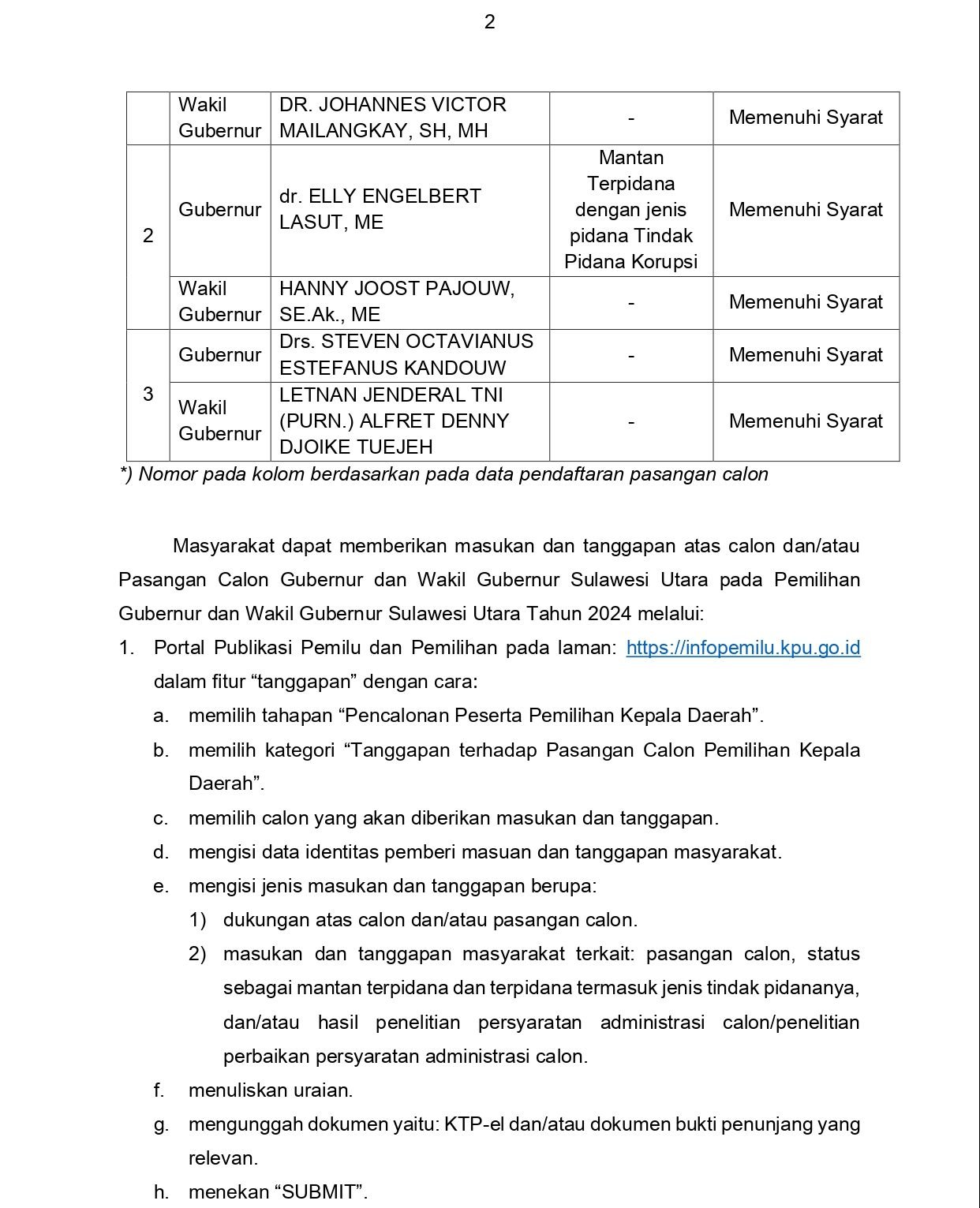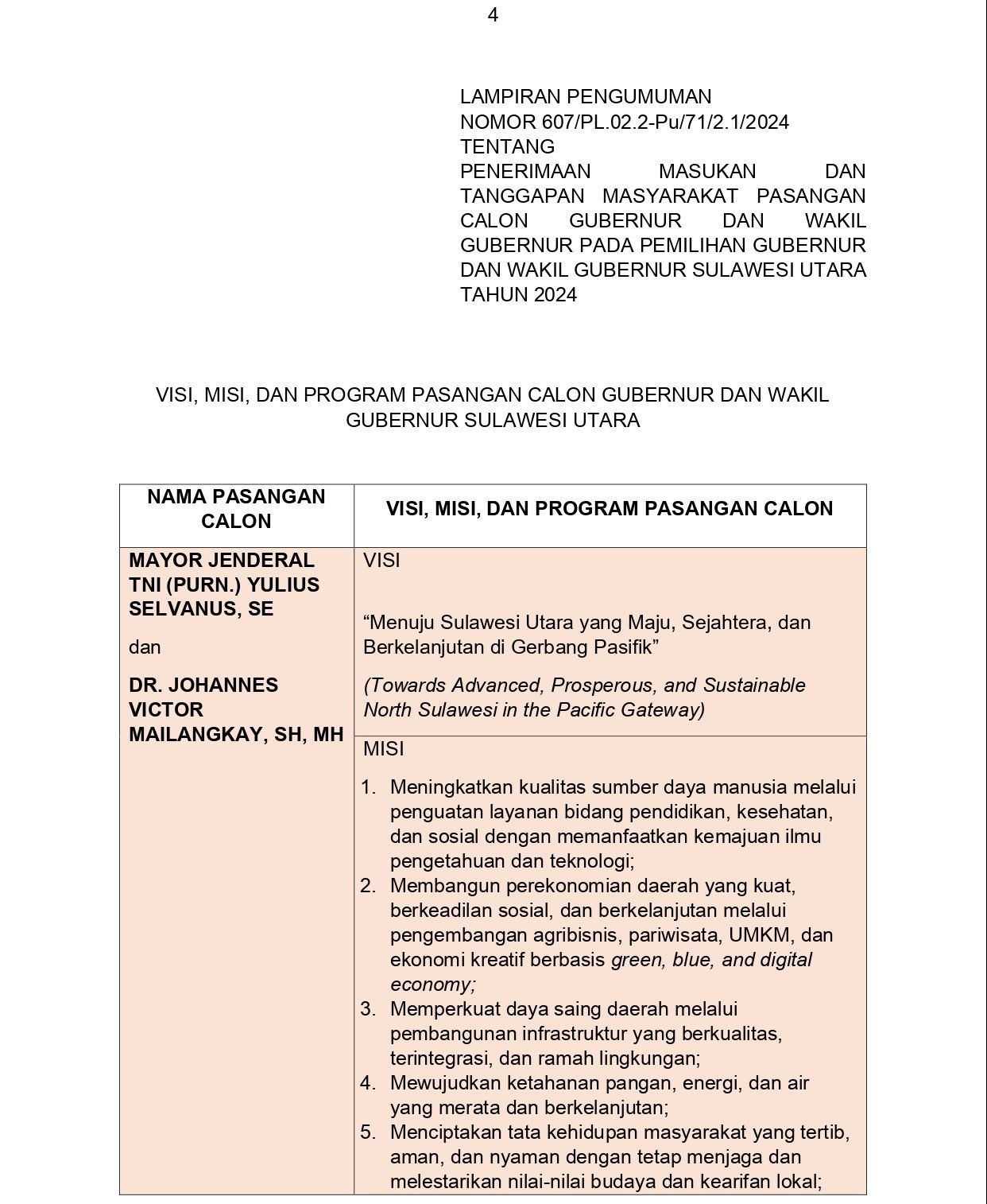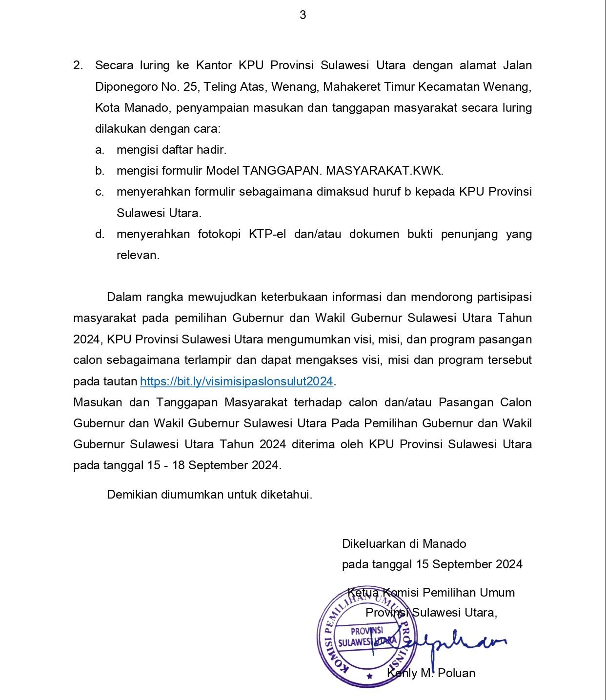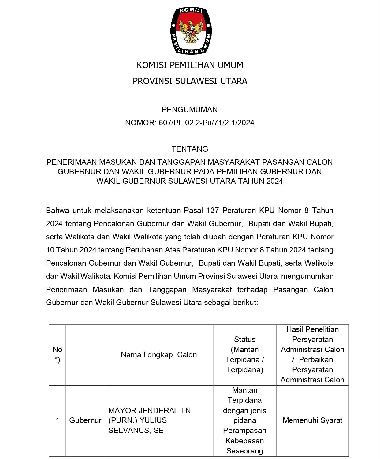 MANADO – Komisi Pemilihan Umum Provinsi Sulawesi Utara (KPU Sulut) menerbitkan Pengumuman Nomor : 607/PL.02.2-Pu/71/2.1/2024 tentang Penerimaan Masukan dan Tanggapan Masyarakat Pasangan Calon Gubernur dan Wakil Gubernur Pada Pemilihan Gubernur dan Wakil Gubernur Sulawesi Utara Tahun 2024.