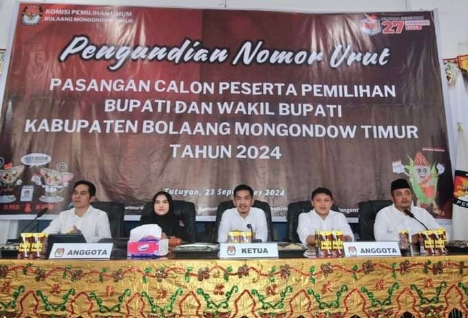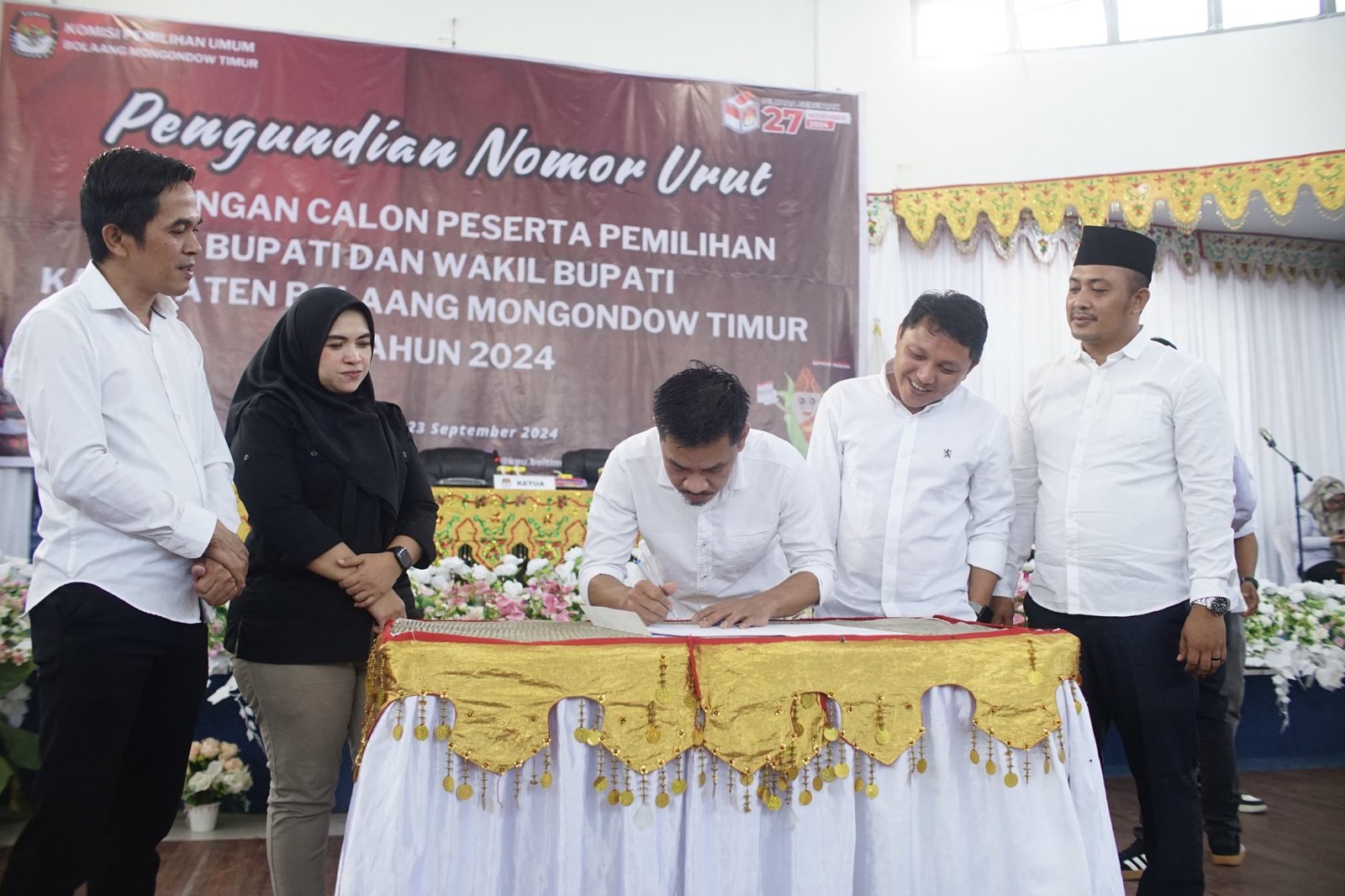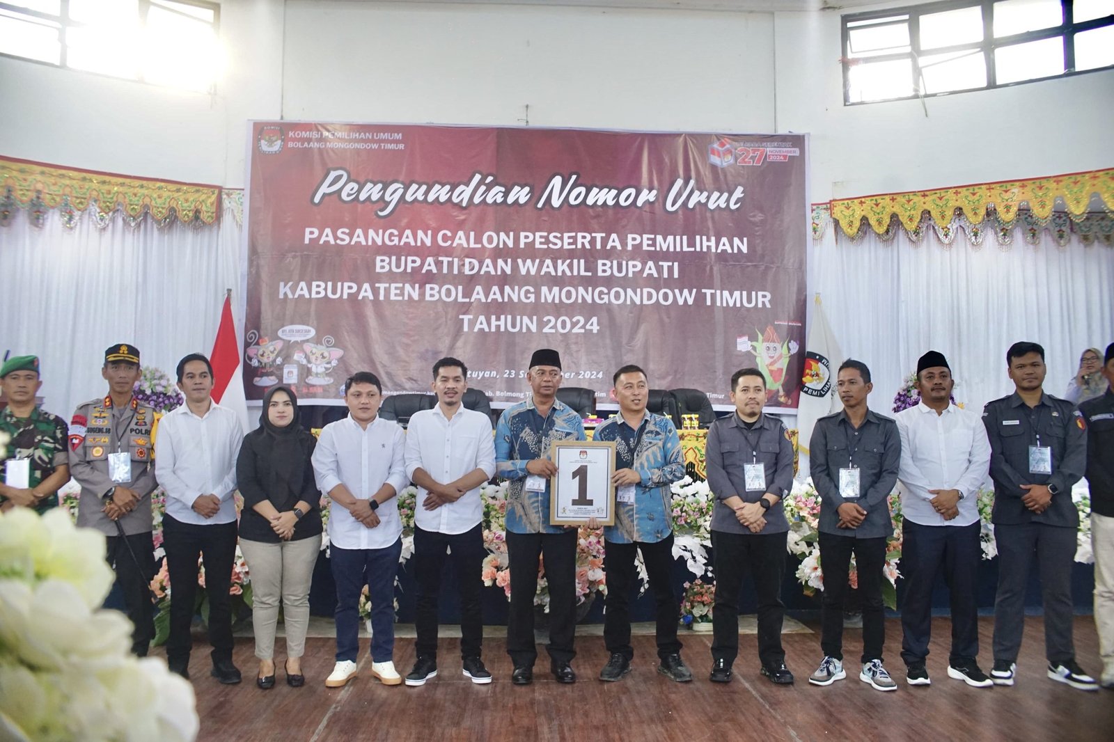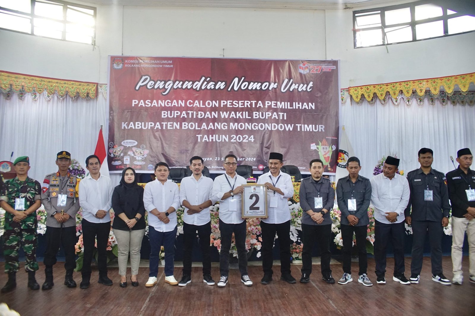 Berikut hasil pengundian nomor urut pasangan calon Bupati dan Wakil Bupati Boltim 2024. Dimana, nomor urut 1 adalah pasangan Oskar Manoppo an Argo Sumaiku yang didukung oleh Partai Demokrat dan Partai Keadilan Sejahtera (PKS). Nomor Urut 2 adalah pasangan Sam Sachrul Mamonto dan Rusmin Mokoagow yang diusung oleh Partai NasDem, PDIP, PAN, Gerindra dan Perindo.