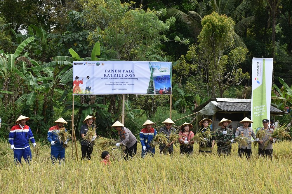 TOMOHON – PT Pertamina Geothermal Energy Tbk (PGE) Area Lahendong (IDX: PGEO) berkolaborasi dengan Fakultas Teknik Universitas Gadjah Mada (UGM) Yogyakarta dan Pemerintah Kelurahan Tondangow dalam pelaksanaan panen padi varietas Superwin yang menggunakan Booster Silika Katrili.