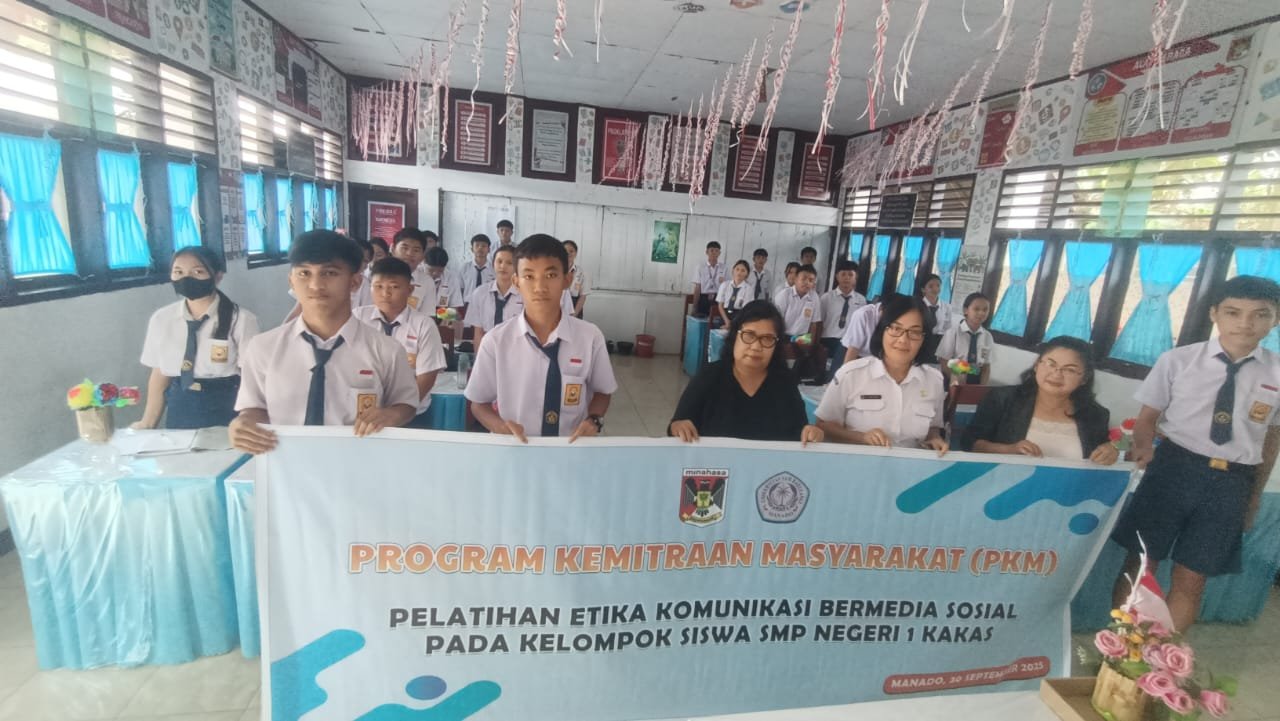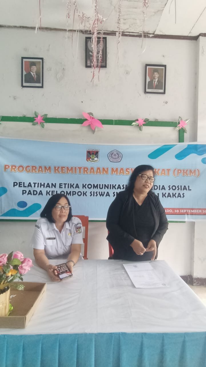Dra. Yuriewaty Pasoreh, MSi yang merupakan tenaga pengajar di Fakultas Ilmu Sosial dan Ilmu Politik bersama Tim PKM melaksanakan Program Kemitraan Masyarakat (PKM) pada Selasa, 30 September 2025, yaitu Pelatihan Etika Komunikasi Bermedia Sosial pada Siswa SMP Negeri I Kakas didampingi oleh Kepala Sekolah dan Wali Kelas.