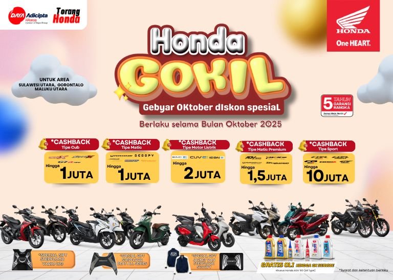 Honda mengajak seluruh masyarakat Sulawesi Utara untuk segera mengunjungi dealer resmi Honda terdekat dan menikmati berbagai penawaran spektakuler dari Honda GOKIL, yang hanya berlaku sepanjang Oktober 2025. (nando/*)
