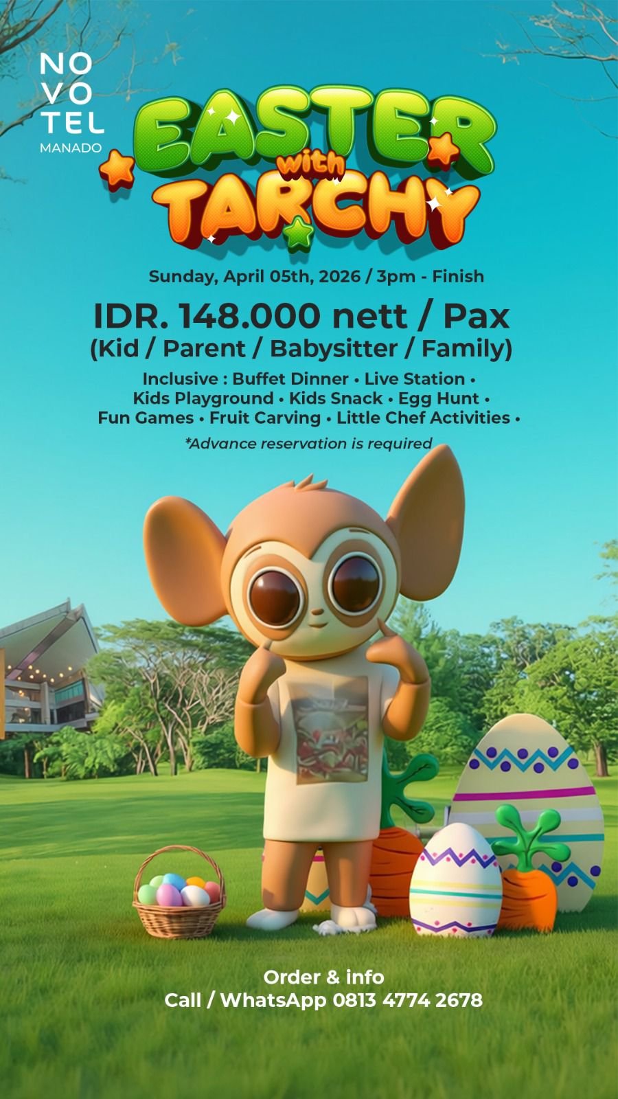 MANADO — Menyambut perayaan Paskah, Novotel Manado menghadirkan acara bertajuk “Easter with Tarchy” yang akan digelar pada Minggu, 5 April 2026 mulai pukul 15.00 WITA hingga selesai.