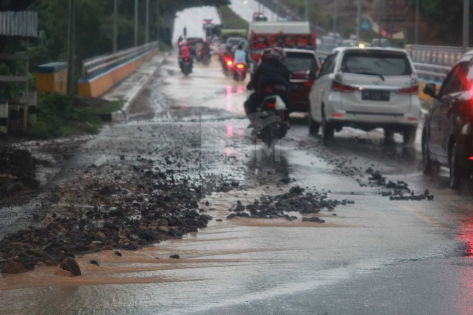FOTO : Membahayakan, Material Batu Berserakan di Jembatan Malendeng